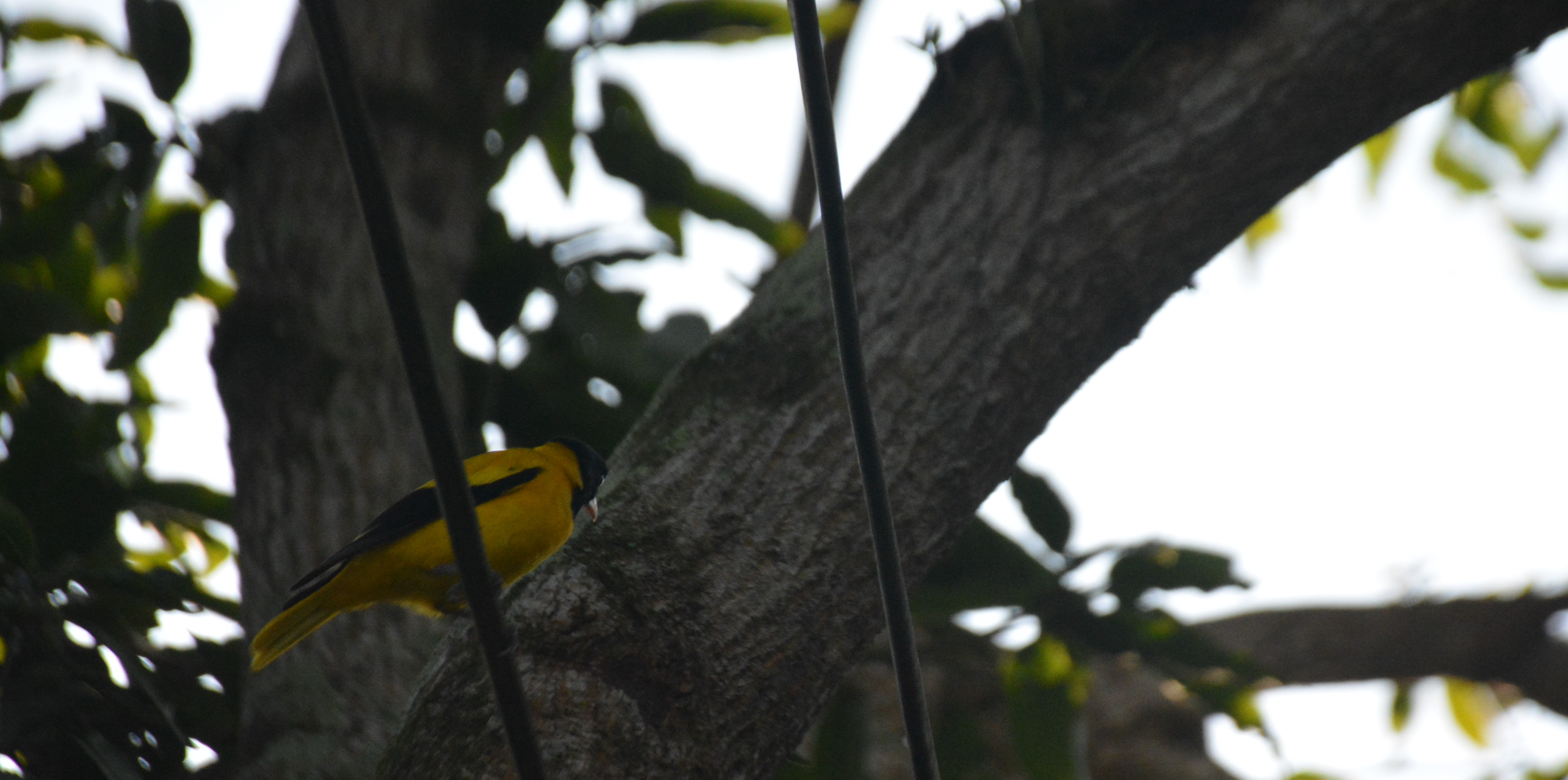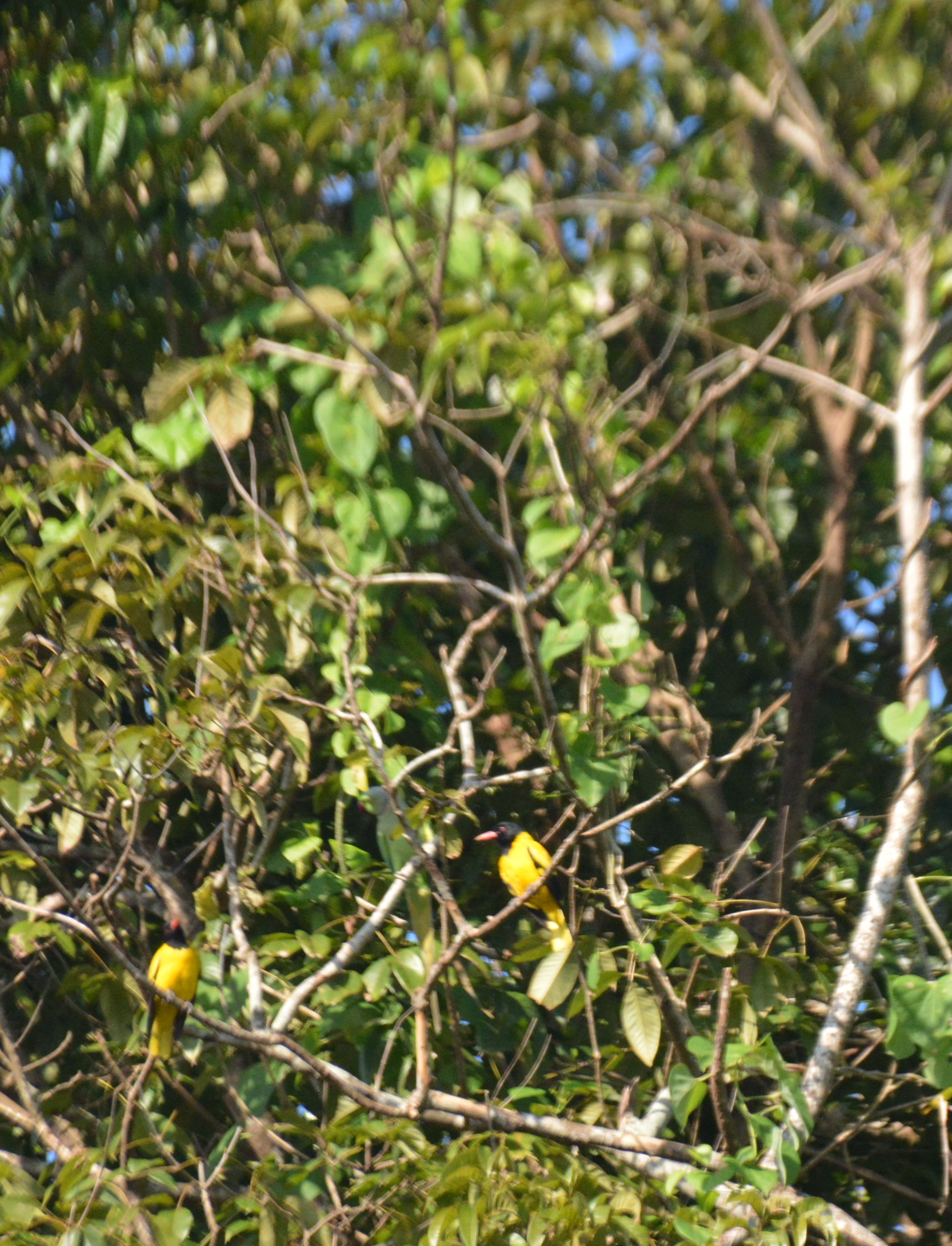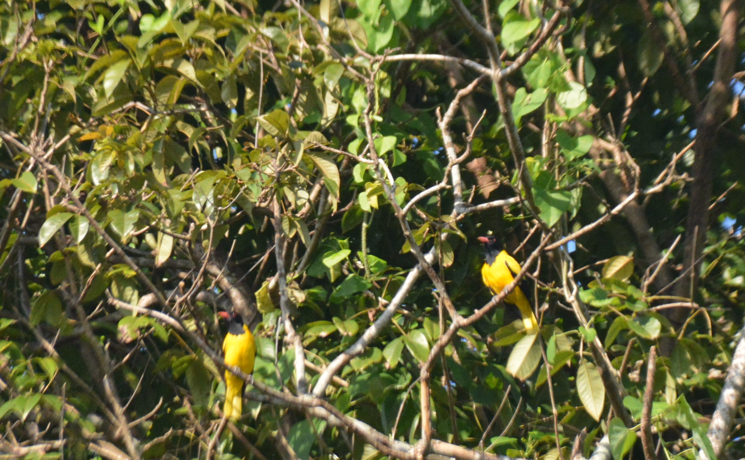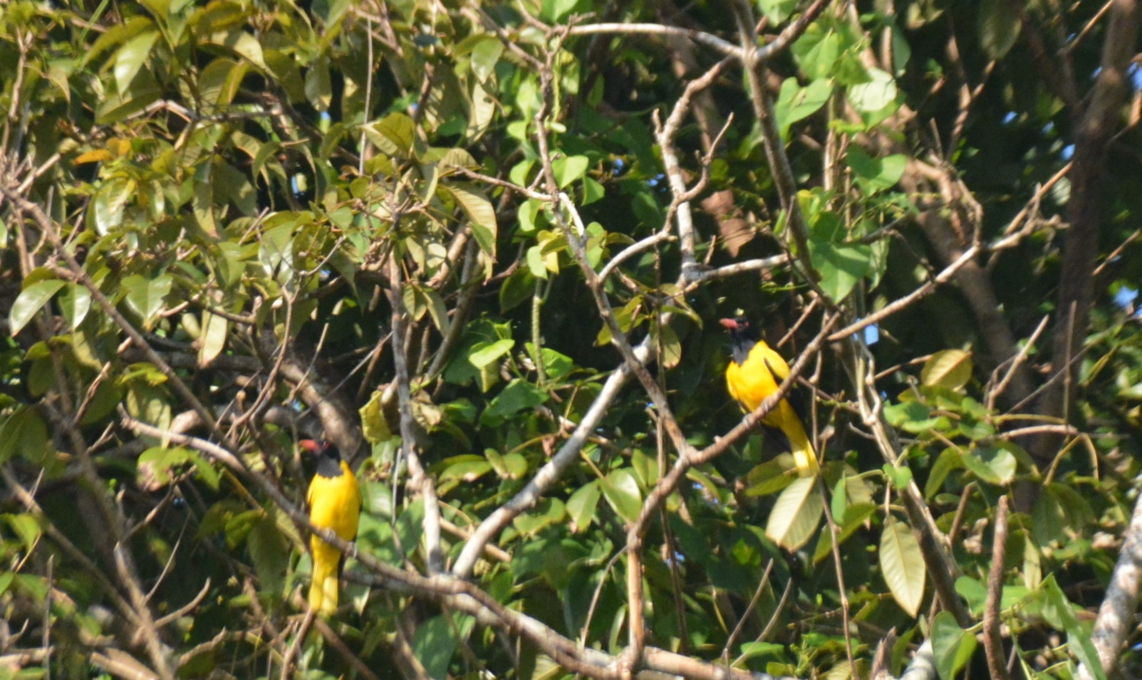 These are far off and close-up photographs of a pair of Black-hooded Orioles (Oriolus xanthornus). All pictures except two are unedited.