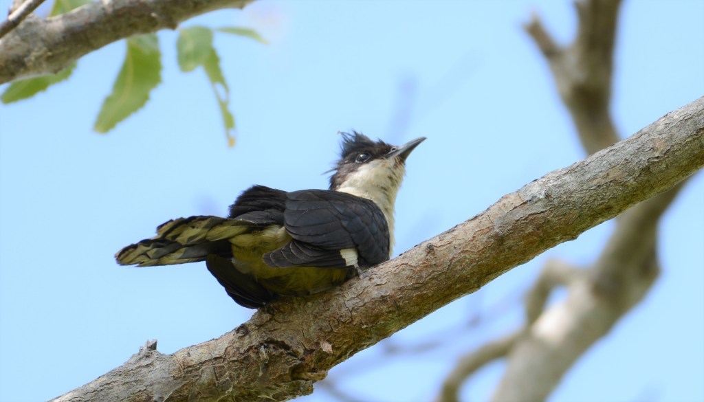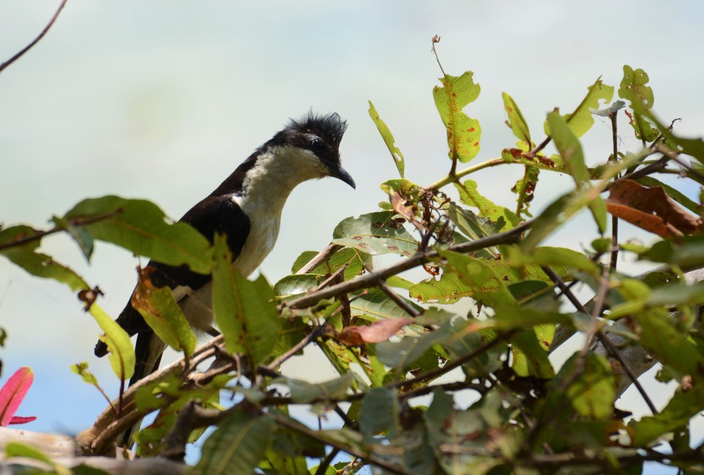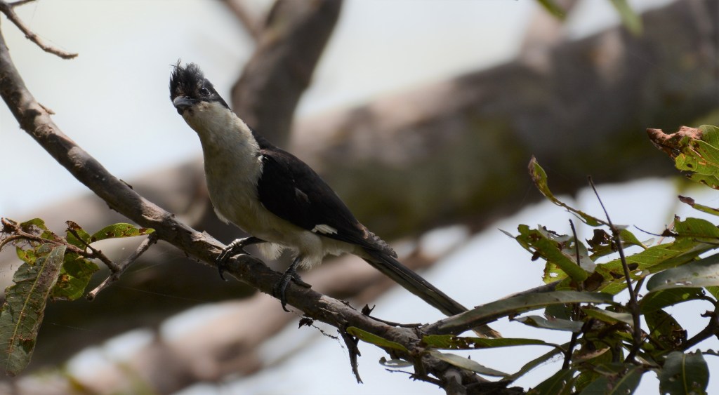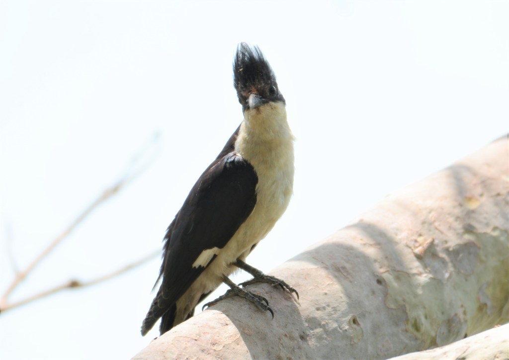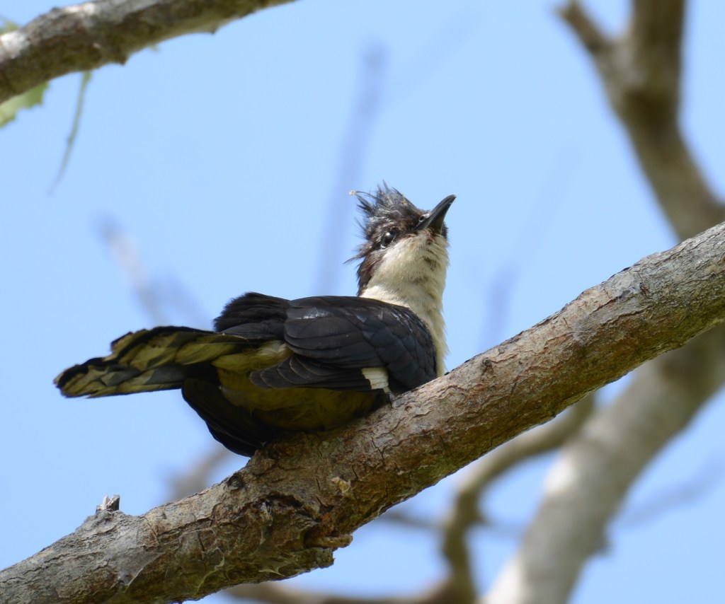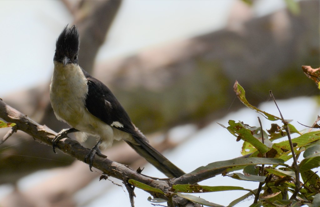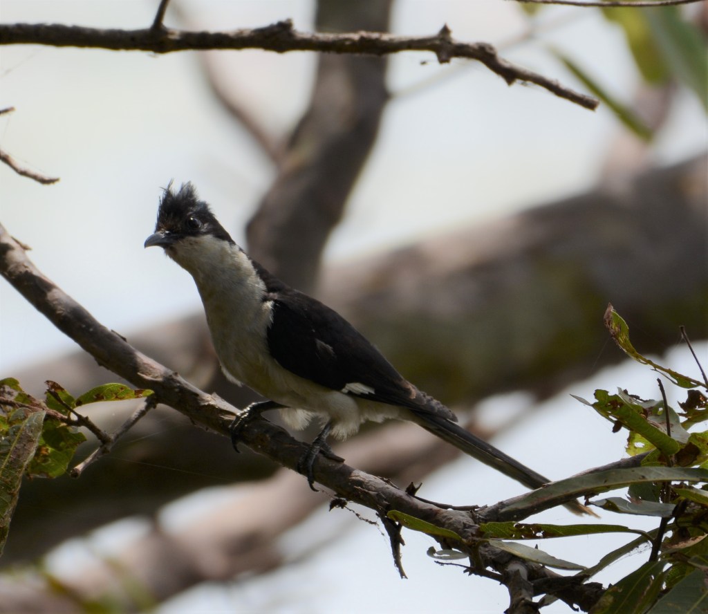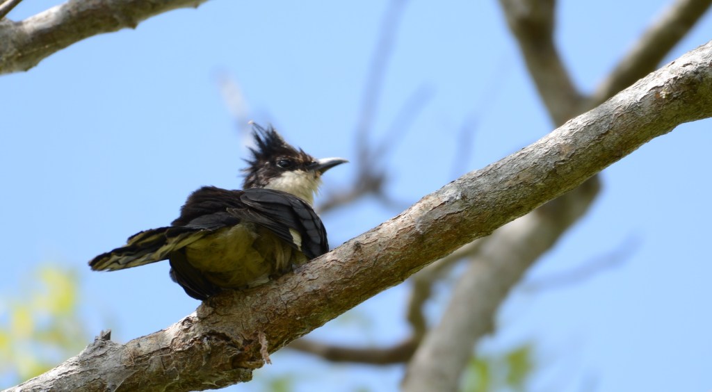 A black and white member of the cuckoo family with a black crown and nape, dark upper wings and a white belly. The crest is spiked and tall with a mohawk like appearance. A white patch in its dark wings assists in the identification of this cuckoo species, when in full flight. In myth and folklore, the Pied Cuckoo is considered to be a sign – a harbinger – for the advent of the monsoon.