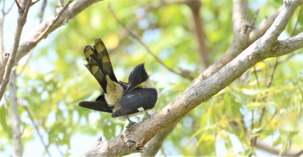 During the breeding season the Jacobin cuckoo is extensively vocal and is a brood parasite that lays its eggs in other nests, with the color of eggs being turquoise. The Pied Cuckoo mostly uses the nests of babblers to lay eggs. Babblers are communal breeders and it sometimes take a mini-village to care for a Pied Cuckoo chick.